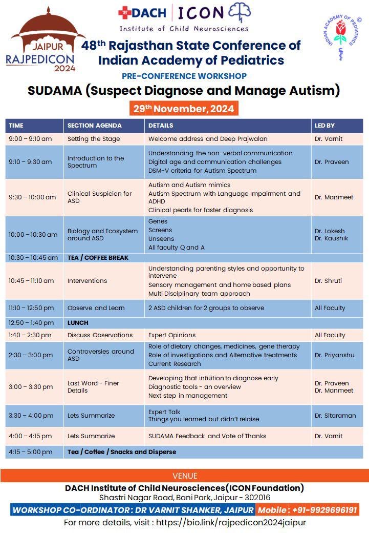 On 29th November 2024, the ICON (Institute for Child of Neurosciences) successfully hosted a specialized workshop titled SUDAMA – SuspectDiagnose and Manage Autism, under the banner of the 48th Rajasthan State Conference of the Indian Academy of Pediatrics (IAP).